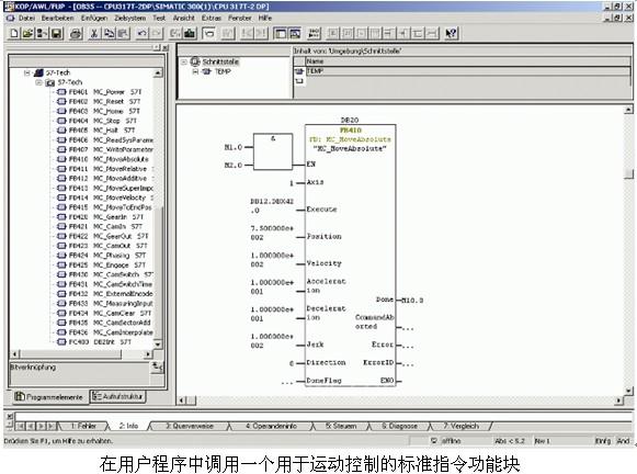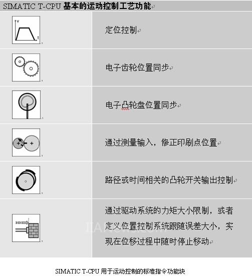 對于運動控制功能的編程,提供符合 PLCopen 標準指令功能塊 (FB)。這些功能塊在界面、功能和執(zhí)行方面均符合國際標準??勺畲蟪潭鹊亟档凸こ膛c組態(tài)、調(diào)試和維護費用。由于這些標準功能塊直接集成在 SIMATIC T-CPU Technology 系統(tǒng)固件中,因而占用的 CPU 工作內(nèi)存很少。