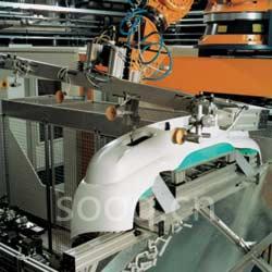如 Decoma 公司生產(chǎn)門檻罩板,則機(jī)器人會將剛從壓鑄機(jī)內(nèi)取出的一對罩板置于一張工作臺上。在機(jī)器人固定罩板的同時,安裝有 14 把切刀的工作臺啟動,并將 14 個澆口同時切下。KR 150 K 用其夾鉗從下方抓緊澆口。隨后,機(jī)器人將罩板也放到輸送帶上,并將澆口拋入一個容器。傳送緩沖器及罩板時,機(jī)器人控制系統(tǒng)會通過一種集成于夾持器內(nèi)的真空技術(shù)對 KR 150 K 是否抓取了鑄件進(jìn)行監(jiān)控。