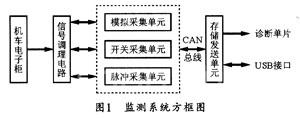 本系統(tǒng)可由信號調(diào)理電路、信號采集板和存儲發(fā)送單元組成。電子柜信號經(jīng)信號調(diào)理電路轉(zhuǎn)換成采集板可以采集的信號后,經(jīng)信號采集板采集后,再通過CAN總線發(fā)送到存儲發(fā)送單元,然后通過標(biāo)準(zhǔn)RS-485接口發(fā)送到診斷單元進(jìn)行故障診斷。數(shù)據(jù)采集也可以通過U盤從USB接口中取出,以便用到地面分析處理系統(tǒng)。整個系統(tǒng)的結(jié)構(gòu)框圖如圖1所示。