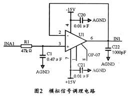 模擬信號的隔離調(diào)理可由運(yùn)放構(gòu)成的電壓跟隨器來完成,電壓跟隨器的特點(diǎn)是輸入阻抗高,可降低外加電路對電子柜系統(tǒng)的干擾,實(shí)現(xiàn)信號隔離。隔離運(yùn)放可選用專用隔離運(yùn)放,器件參數(shù)主要應(yīng)考慮輸入阻抗等。由于待采集的模擬信號范圍為1~8 V不等,為保證數(shù)據(jù)的可靠性,這些信號在采集前還需進(jìn)行適當(dāng)?shù)姆糯?,具體放大倍數(shù)應(yīng)根據(jù)A/D轉(zhuǎn)換器的參數(shù)確定,一般為1~10倍,運(yùn)放的選擇也應(yīng)視實(shí)際情況而定。其中一通道的模擬信號調(diào)理電路圖如圖2所示。