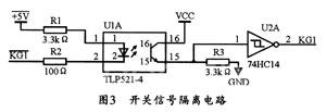 開關(guān)信號都是司機(jī)給定和電子控制柜發(fā)出響應(yīng)的信號,或系統(tǒng)發(fā)出的比較慢的指令信號,這些信號高電平時(shí)為5 V,低電平為0 V,本設(shè)計(jì)使用TLP521-4來進(jìn)行光電隔離,其開關(guān)信號隔離電路如圖3所示。當(dāng)KGI為高電平時(shí),光藕截止。此時(shí)可通過3.3 kQ的下拉電阻R3使整形電路74HCl4的輸入為低電平;而當(dāng)KGI為低電平時(shí)。光耦導(dǎo)通,整形電路74HCl4的輸入變?yōu)楦唠娖?。R2直接與電子控制柜信號相連接,可起保護(hù)作用。該電路的實(shí)驗(yàn)測試結(jié)果表明,在直接測量整形后的電路時(shí),其Ton=12μs,toff=35μs,可見其可以滿足系統(tǒng)開關(guān)信號的采集要求。