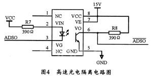 脈沖信號是電子控制柜產(chǎn)生的三段橋晶閘管觸發(fā)信號,具有高頻、高速等特點(diǎn)。其信號隔離需采用高速光電隔離器隔離,本系統(tǒng)選用高速光耦為6N137,其高速光電隔離電路如圖4所示。