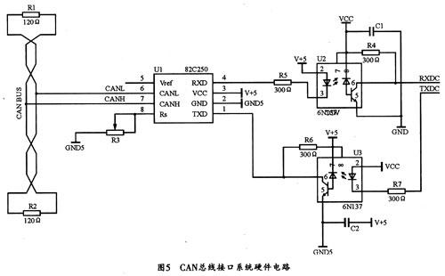 本系統(tǒng)采用的是以Philips公司生產(chǎn)的的P87C591單片機(jī)為控制核心的信號采集系統(tǒng)。P87C591是一個單片8位高性能微控制器。該器件具有片內(nèi)CAN控制器,它采用強(qiáng)大的80C51指令集,并成功的包括了sJAl000型CAN控制器的PeliCAN功能。由于單片機(jī)P87C591中內(nèi)嵌有CAN控制器sJAl000的信號輸出口且驅(qū)動能力較低,因此,本系統(tǒng)中加入了CAN總線接口驅(qū)動芯片P82C250,該器件主要是為高速通訊應(yīng)用而設(shè)計(jì)的,它可對總線提供差動發(fā)送能力,并對CAN控制器提供差動接收能力。另外,為了增加通信距離,保護(hù)總線、降低干擾,提高系統(tǒng)的瞬間抗干擾能力,本設(shè)計(jì)還在P87C591和P82C250之間加入了由高速光耦6N137構(gòu)成的隔離電路。其具體的CAN總線接口電路如圖5所示。