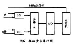 模擬量采集單元的主要功能可以劃分為微處理器及其控制部分、CAN通訊接口部分、多路模擬量輸入通道選擇開關(guān)、采樣保持芯片、模數(shù)轉(zhuǎn)換芯片等。根據(jù)單元劃分的粗細(xì)程度。需采集的模擬量共有30~60路不等。因此,在如此多信號需采集和對信號采集同步性要求較高的情況下,若采用一般采集方法,即由多路開關(guān)對信號進(jìn)行選擇,然后經(jīng)公共的S/H、MD器進(jìn)行采集。那么,即使S/H、MD器的速度相當(dāng)高,得出的結(jié)論也是不可靠的。所以,信號需采用同步采集??紤]到每路一個MD轉(zhuǎn)換器會增加系統(tǒng)的復(fù)雜性和成本,并且系統(tǒng)對信號采集的速度要求并不高,因此,MD轉(zhuǎn)換器還是共用一個為好,但若每路一個S/H,由單片機(jī)發(fā)出的觸發(fā)信號同時(shí)會觸發(fā)所有的S/H,保證這可采集的同步性。其信號采集框圖如圖6所示。