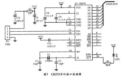存儲發(fā)送單元主要包括微處理器及其控制部分、CAN通訊接口部分、串口擴(kuò)展和USB接口等。其中微處理器及其控制部分、CAN通訊接口部分跟前面介紹的模塊基本一致。串口擴(kuò)展部分帶有兩個RS-232接口和一個RS-485接口,并帶有跳線可以選擇兩種狀態(tài)為一個RS-232接口和一個RS-485接口或兩個RS-232接口而沒有RS-485接口。串口擴(kuò)展采用16C550芯片。USB接口系統(tǒng)利用CH375作為控制器。并可通過串行輸入輸出或并行輸入輸出和中斷輸出來方便地實(shí)現(xiàn)USB移動存儲設(shè)備與單片機(jī)系統(tǒng)的連接。CH375的并行接口連接圖如圖7所示。
