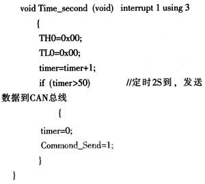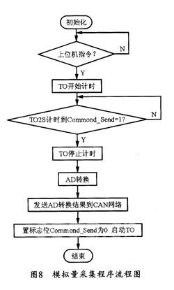 軟件設(shè)計(jì)就是在模擬量采集單元初始化后等待上位機(jī)發(fā)來的數(shù)據(jù)采集請求指令,然后啟動定時(shí)器TO并進(jìn)行A/D轉(zhuǎn)換,再將轉(zhuǎn)換結(jié)果按CAN標(biāo)準(zhǔn)幀格式打包發(fā)送給存儲發(fā)送單元。其程序流程圖如圖8所示。其中,定時(shí)器TO的中斷子程序代碼如下: