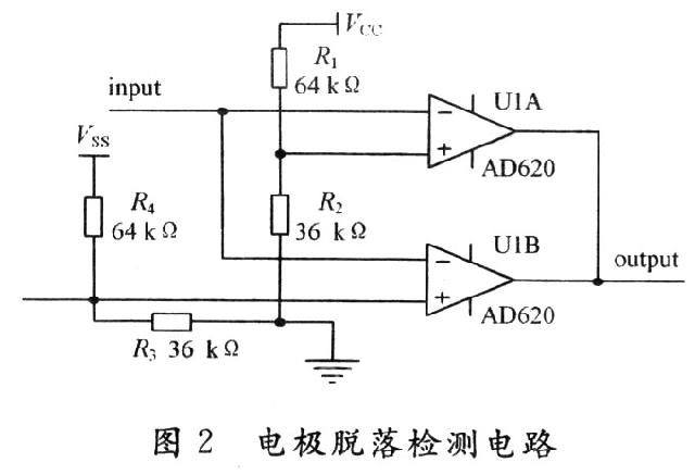 由于此系統(tǒng)應用于人體日常生活中,人常常處于活動狀態(tài),這樣輸入電極很可能脫落,從而使系統(tǒng)不能正常工作。為此,設計了導聯(lián)電極脫落檢測電路如圖2所示。