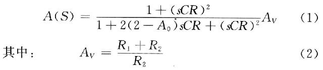 陷波器的電路如圖3所示,該電路是帶雙T網絡的有源濾波器,其傳遞函數(shù):