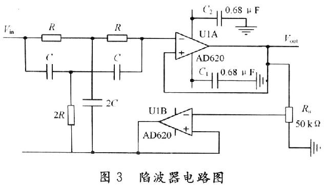 其中,濾波采用二階高(低)通濾波電路,用于消除O.05~100 Hz頻帶以外的肌電等干擾信號,工頻中的其余高次諧波也可被濾除掉。同時,采用有源雙T帶阻濾波電路進一步抑制50 Hz工頻干擾。