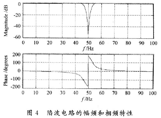 (2)與以往雙T型50 Hz陷波器不同的是,該設計電路引入放大器形成正反饋,以減小阻帶寬度。