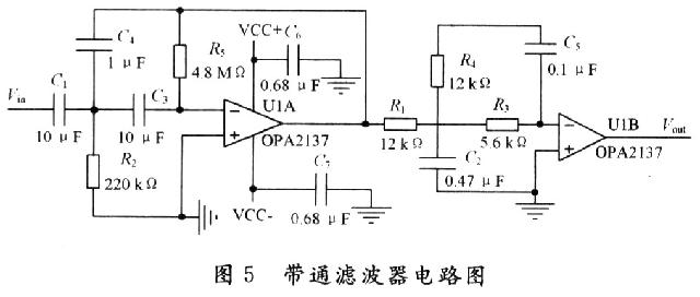 帶通濾波器電路如圖5所示,采用的是帶反饋的有源濾波器。該電路前半部分是0.05 Hz的高通濾波器,后半部分為100 Hz的低通濾波器。