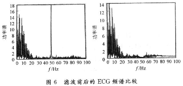 圖6是Matlab的濾波仿真結果,從圖中可以看出,信號在50 Hz處被很好地抑制了,濾波的效果非常理想,完全可以達到臨床實用的要求。