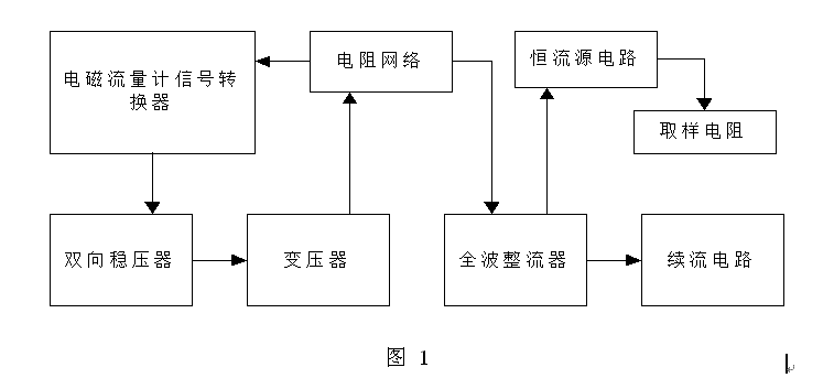 本設(shè)計包括待校驗的外部電磁流量計信號轉(zhuǎn)換器和輸出模擬電磁流量計要測量的流體流速信號的電阻網(wǎng)絡(luò),外部電磁流量計信號輸轉(zhuǎn)換器的勵磁電流輸出,經(jīng)一個雙向穩(wěn)壓器連接一個變壓器的初級輸入,變壓器的次級輸出連接電阻網(wǎng)絡(luò)的輸入,電阻網(wǎng)絡(luò)的輸出經(jīng)一個全波整流器后,分別連接一個續(xù)流電路的輸入和一個恒流源電器的輸入,恒流源電路的輸出連接一個取樣電阻;所述的電阻網(wǎng)絡(luò)同時輸出模擬電磁流量計要測量的流體流速信號,連接到外部電磁流量計信號轉(zhuǎn)換器的信號輸入。