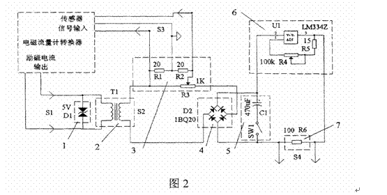1)將電磁流量計勵磁電流S1 的兩個輸出端分別與雙向穩(wěn)壓電路兩端及變壓器的初級線圈的兩個輸入端并聯(lián),變壓器次級線圈輸出與S1電氣隔離的信號同步源和工作電源S2 。