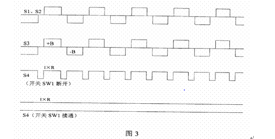 3)由電容和開關(guān)SW1組成的續(xù)流電路并聯(lián)在全波整流器的直流輸出端,續(xù)流電路的開關(guān)SW1接通時,使可調(diào)恒流源確定的電流I值A(chǔ)在取樣電阻上形成可直接測量的直流電壓信號S4,通過信號S4可以得到信號S3交變電流I的正負幅值A(chǔ),A=S4/R,R是取樣電阻的阻值。