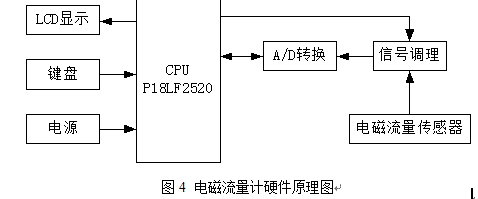 利用PIC18LF2520等芯片就可以對電阻R6兩端的電壓信號和S3上的方波信號進行測量。從而可以獲得調(diào)節(jié)電壓值和流速信號值。其電路框圖如圖4所示。電路的硬件設(shè)計主要包括信號調(diào)理,A/D轉(zhuǎn)換,LCD顯示及單片機相關(guān)的外圍電路等部分。電磁流量傳感器得到的電壓信號經(jīng)過信號調(diào)理電路處理后,由A/D轉(zhuǎn)換器進行模數(shù)轉(zhuǎn)換,再由CPU進行數(shù)值處理,采用液晶顯示器顯示相應(yīng)的流速。各個模塊的只要功能如下: