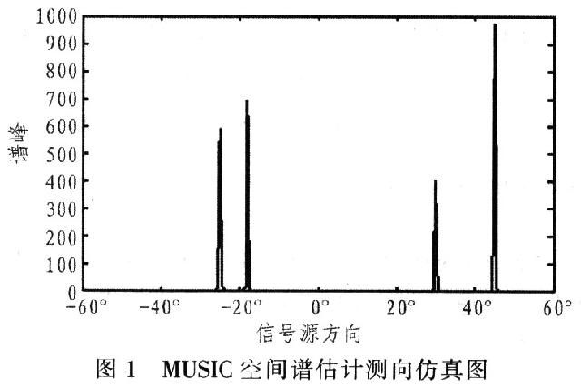 空間譜估計測向是一種以天線陣輸出信號的空間相關(guān)特性為基礎(chǔ)的超分辨譜估計方法。MUSIC算法是基于特征結(jié)構(gòu)分析的空間譜估計方法,其測向原理引是根據(jù)矩陣特征分解理論,對陣列輸出協(xié)方差矩陣進行特征分解,將信號空間分解為噪聲子空間ENH和信號子空間EHS,利用噪聲子空間ENH與陣列的方向矩陣的列矢量正交的性質(zhì),構(gòu)造空間譜函數(shù)P(θ)并進行譜峰搜索,從而估計出波達方向信息。圖1給出采用MUSIC算法進行空間譜估計技術(shù)仿真測得的信號源方向消息,其信號源方向分別為45°,30°,一18°,25°。根據(jù)圖1 MUSIC算法仿真結(jié)果可以看出,該算法可精確確定信號源方向信息。