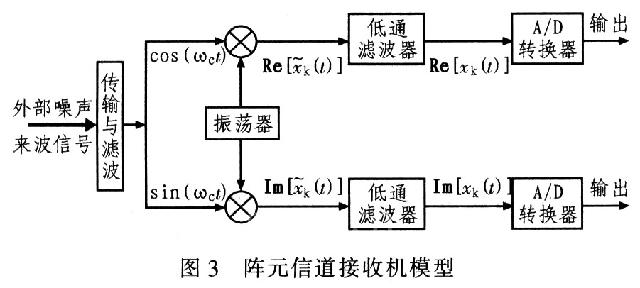 每一天線陣元的輸出送至各自的接收機輸入端。如N個天線陣元,就有N個完全相同的接收機。接收機將信號放大、變頻到適合A/D轉(zhuǎn)換的頻率,從而輸出中頻信號。也可將A/D轉(zhuǎn)換器和接收機集成一體,直接輸出數(shù)字信號。為了完整保存各天線陣元接收的信號幅度和相位信息,一般采用I、Q通道方法,即在中放末級采用正交混頻,將相位相差90°兩路本振信號送到兩個混頻器,其輸出的低通信號即為I和Q通道信號。I和Q通道各接一A/D轉(zhuǎn)換器,其輸出就是數(shù)字化的復(fù)信號的實部和虛部。各個陣元的接收機模型如圖3所示。