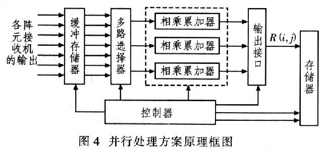 并行方案與串行方案的區(qū)別在于:并行方案使用多個并行相乘累加器進行計算。這樣可有效提高整個系統(tǒng)的處理速度。并行處理的方案應(yīng)當做到使各處理器的負載平衡,對于含8個陣元的測向系統(tǒng),需要求出36個元素的值,因此可選用2,3,4,6,12,18,36個相乘累加器的不同的并行處理方案。顯然相乘累加器越多,處理速度越快,但其成本也高。