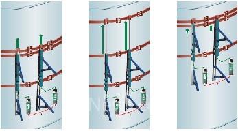 爬高時,上夾緊帶被釋放,然后由協(xié)調(diào)工作的執(zhí)行器向上推高1.2 米,然后再被夾緊,下環(huán)被釋放。然后執(zhí)行器收緊,平滑地將下平臺拉上去,下平臺再被夾緊。下降時過程相反。這意味著整個平臺一體式升高和下降,而不是像傳統(tǒng)登高平臺那樣分段進(jìn)行,這樣有效確保了工作環(huán)境的安全。
