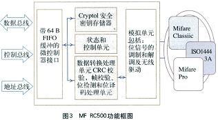 MFRC500是PHILIPS公司為RFID卡設(shè)計(jì)的專用讀卡芯片,它與射頻卡之間通信標(biāo)準(zhǔn)兼容ISO14443A,其功能框圖如圖3所示。