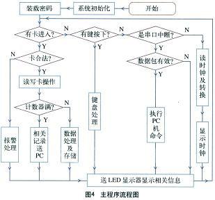 單片機(jī)的程序包括:RFID卡讀/寫(xiě)/密碼驗(yàn)證/擦除操作程序,與RC500通信中斷處理程序,鍵盤中斷處理程序,與PC機(jī)通信中斷處理程序,顯示程序及存儲(chǔ)器讀寫(xiě)程序等。讀卡器的主程序流程如圖4所示。