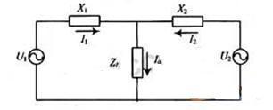 多臺(tái)逆變器并聯(lián)運(yùn)行時(shí)應(yīng)滿足下列條件:各逆變器的交流輸出電壓要保證同頻、同相、同幅,否則就會(huì)在各逆變器之間引起環(huán)流,影響系統(tǒng)的穩(wěn)定運(yùn)行,甚至造成嚴(yán)重的事故。下面以2臺(tái)逆變電源對(duì)同一負(fù)載供電為例進(jìn)行分析,等效電路圖如圖1所示。