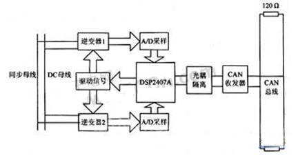 設(shè)X1=X2,則由上述公式可得出結(jié)論:在逆變電源系統(tǒng)中,各逆變單元的相位角之差將導(dǎo)致有功功率的差異,從而形成有功環(huán)流;各逆變單元輸出電壓的幅值差將導(dǎo)致無(wú)功功率的差異,從而形成無(wú)功環(huán)流。在相位同步的前提下,本文提出了一種利用現(xiàn)場(chǎng)CAN總線來(lái)實(shí)現(xiàn)逆變電源系統(tǒng)各逆變單元均流的方案。