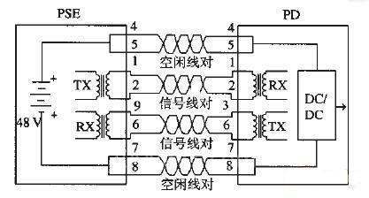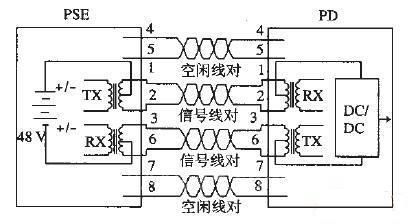 一種是端點PSE(Endpoint PSE),即在同一個設(shè)各內(nèi)嵌入了以太網(wǎng)交換機(jī)等數(shù)據(jù)交換模塊和電源模塊。在這種供電模式中,可以選擇以太網(wǎng)雙絞線中的信號線對(1,2和3,6)或者“空閑線對”(4,5和7,8)來承載48 V直流電源。當(dāng)選擇信號線對傳輸電源時,48 V DC通過加在隔離變壓器的兩個中心抽頭上來實現(xiàn)對受電設(shè)各的供電(圖1),從而避免了對數(shù)據(jù)信號的影響。由于電源可以疊加在信號線對上,所以這種方式的POE系統(tǒng)可以支持千兆以太網(wǎng)。將端點PSE應(yīng)用于網(wǎng)絡(luò)系統(tǒng)時,由于需要更換現(xiàn)有的網(wǎng)絡(luò)設(shè)各,所以端點PSE較適合于建設(shè)新的網(wǎng)絡(luò)系統(tǒng)。