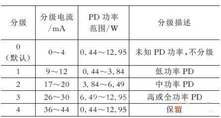 由于受電設(shè)備的種類很多,需要的電源功率各不相同,所以在供電設(shè)備正確檢測到受電設(shè)備以后,接著向線纜上施加一個15 V至20 V的探查電壓,以決定輸出多大的功率給連接在線纜上的受電設(shè)備,這個過程稱為PD功率分級。在這個過程中,符合規(guī)范的受電設(shè)備會將一個分級電阻串聯(lián)到線纜中。同時,受電設(shè)備表現(xiàn)得近似為一個恒流源,用來指示本用電設(shè)備將要吸取的最大功率。供電設(shè)備通過測量以太網(wǎng)雙絞線中的電流大小來確定受電設(shè)備屬于哪個功率分級,然后輸出相應(yīng)的功率。802.3af標(biāo)準(zhǔn)規(guī)定了。0~4共5個功率級別,如表3所示。