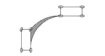 內(nèi)輪差是車輛轉(zhuǎn)彎時的前內(nèi)輪的轉(zhuǎn)彎半徑與后內(nèi)輪的轉(zhuǎn)彎半徑之差。由于內(nèi)輪差的存在,車輛轉(zhuǎn)彎時,前、后車輪的運動軌跡不重合。內(nèi)輪差的大小與轉(zhuǎn)動方向盤的幅度和車輛軸距的長短有關(guān),方向盤轉(zhuǎn)動幅度越大即轉(zhuǎn)向角度越大,內(nèi)輪差越大,反之越小;車輛的軸距越長,內(nèi)輪差越大,反之則越小。重型汽車車身都比較長,尤其是車頭轉(zhuǎn)過去后,還有很長的車身沒有轉(zhuǎn)過來,極易形成大型車輛司機的“視覺盲區(qū)”,路人步入內(nèi)輪范圍后,容易造成生命危險。如圖1中的陰影部分為內(nèi)輪差的形成區(qū)域。