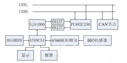 本系統(tǒng)將單片機技術(shù)、超聲波測距技術(shù)與CAN總線通信技術(shù)等相結(jié)合,可檢測汽車在轉(zhuǎn)彎過程中汽車內(nèi)側(cè)狀況。預警系統(tǒng)的三對測距傳感器獨立工作,通過CAN總線經(jīng)接口芯片PCA82C250驅(qū)動將數(shù)據(jù)傳輸?shù)街骺刂破?。測距采用SensComp 600傳感器和SensComp 6500超聲波距離模塊;單片機采用低成本的AT89C51主要功能為:1、用于控制測距傳感器并把測量數(shù)據(jù)實時通過CAN控制器SJA1000發(fā)送到CAN總線上;2、通過溫度傳感器DS18B20傳送過來的溫度參數(shù),修正超聲波在空氣中的傳播速度;在PCA82C250與SJA1000之間還增加了高速線性光耦6N137進行隔離,有效地防止汽車在惡劣工作環(huán)境下的瞬態(tài)干擾,確保數(shù)據(jù)傳輸?shù)臏蚀_性。因為三對測距傳感器硬件系統(tǒng)完全相同,此次只用一個進行說明,系統(tǒng)硬件結(jié)構(gòu)如圖2所示。