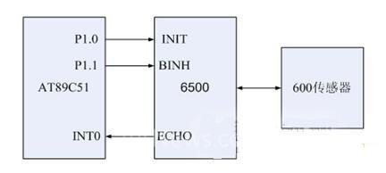 本系統(tǒng)采用單片機AT89C51來實現(xiàn)對SensComp 600系列超聲波傳感器和SensComp 6500超聲波測距模塊的控制。SensComp 600系列靜電換能器的頻率為50kHz;測量范圍為6英寸到35英尺(0.15米~10.7米)。配合SensComp的6500驅(qū)動電路時傳感器測量范圍能從2.5厘米到15.2米。AT89C51通過P1.0引腳控制超聲波的發(fā)送,然后單片機不停的檢測INT0引腳,當INT0引腳的電平由低電平變?yōu)楦唠娖綍r就認為超聲波已經(jīng)返回。計數(shù)器所計的數(shù)據(jù)就是超聲波所經(jīng)歷的時間,通過換算就可以得到傳感器與障礙物之間的距離,如圖3所示為超聲波測距的硬件示意圖。