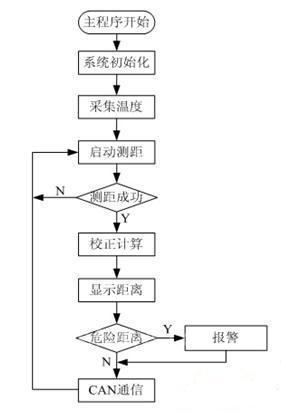 軟件采用模塊化設(shè)計,程序由主程序、測距子程序、CAN總線通信子程序等模塊組成。調(diào)試過程中對其中每個功能模塊和子程序逐一調(diào)試,在每個子程序都完成其指定的功能后,再進行整合完成最后的綜合調(diào)試。輪差預警系統(tǒng)的主程序流程圖、測距子程序流程圖分別如圖5、6所示。汽車轉(zhuǎn)彎時啟動預警系統(tǒng),AT89C51先把P1.0置0,啟動超聲波傳感器發(fā)射超聲波,同時啟動內(nèi)部定時器T0開始計時。我們采用的超聲波傳感器是收發(fā)一體的,在發(fā)送完16個脈沖后超聲波傳感器還有余震,為了從返回信號識別消除超聲波傳感器的發(fā)送信號,要檢測返回信號必須在啟動發(fā)射信號后2.38ms才可以檢測。當超聲波信號碰到障礙物時信號立刻返回,微處理器不停的掃描INT0引腳,如果INT0接收的信號由低電平變?yōu)楦唠娖?,此時表明信號已經(jīng)返回,微處理器進入中斷關(guān)閉定時器。再把定時器中的數(shù)據(jù)結(jié)合溫度傳感器送來的現(xiàn)場溫度經(jīng)過校正換算,可以得出超聲波傳感器與障礙物之間的真實距離;然后顯示測距結(jié)果,若測距結(jié)果低于設(shè)定閥值則產(chǎn)生報警信號;最后把得到的距離數(shù)據(jù)實時的通過CAN總線網(wǎng)絡(luò)向汽車主控制器發(fā)送,這樣就可以實現(xiàn)預警系統(tǒng)與CAN網(wǎng)絡(luò)其他節(jié)點和上位機的通信和網(wǎng)絡(luò)控制功能。