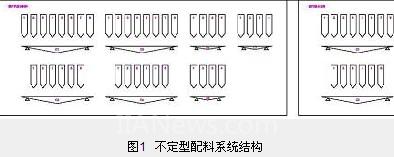 不定型耐火材料廣泛應用于冶煉高爐等,其中酸中性耐火材料有約35種原料按照不同重量配比組成。堿性耐火材料有約14種原料按照不同重量配比組成。不定型配料系統(tǒng)結構如圖