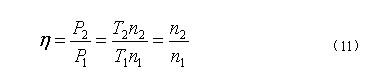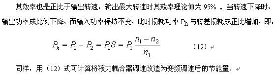 液力偶合器是通過(guò)控制工作腔內(nèi)工作油液的動(dòng)量矩變化,來(lái)傳遞電動(dòng)機(jī)能量,電動(dòng)機(jī)通過(guò)液力偶合器的輸入軸拖動(dòng)其主動(dòng)工作輪,對(duì)工作油進(jìn)行加速,被加速的工作油再帶動(dòng)液力偶合器的從動(dòng)工作渦輪,把能量傳遞到輸出軸和負(fù)載。液力偶合器有調(diào)速型和限矩型之分,前者用于電氣傳動(dòng)的調(diào)速,后者用于電機(jī)的起動(dòng),系統(tǒng)中的液力偶合器在電機(jī)起動(dòng)時(shí)起緩沖作用。由于液力偶合器的結(jié)構(gòu)與電磁轉(zhuǎn)差離合器類似,仿照電磁調(diào)速器效率的計(jì)算方法,可得: