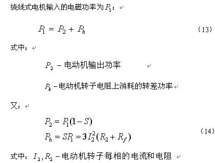 在(14)式中,若S=0.5,電磁功率有一半消耗在轉(zhuǎn)子電阻 上,調(diào)速系統(tǒng)效率低于50%。利用(14)式,只要知道電機(jī)運(yùn)行的轉(zhuǎn)速,就可方便地計(jì)算繞線式電機(jī)串接電阻調(diào)速消耗的電能,節(jié)能量的計(jì)算就非常簡(jiǎn)單了。