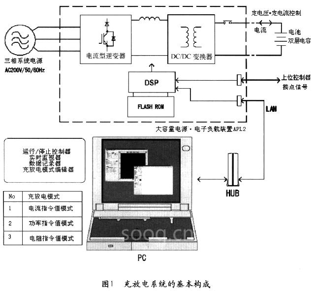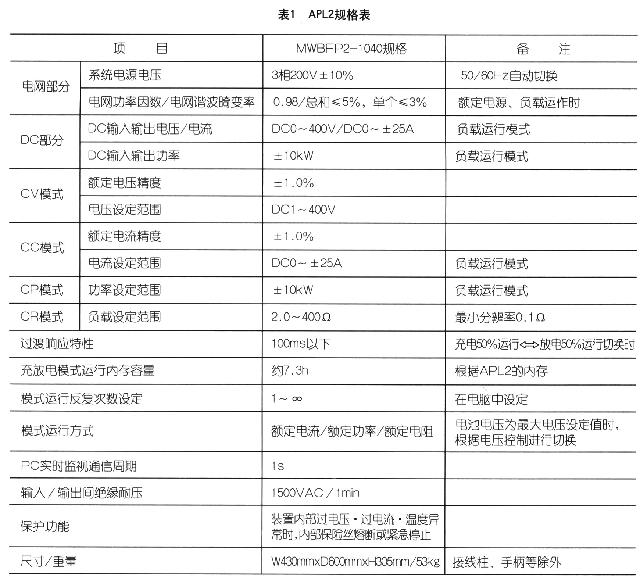第一種設(shè)計(jì)方式為將電壓型系統(tǒng)聯(lián)合逆變器和雙向升壓降壓變頻器組合作為電池充放電裝置,第二種設(shè)計(jì)方式則采用大容量電源及電子負(fù)載裝置(以下簡(jiǎn)稱APL2)。通過(guò)APL2可以任意變換電池電壓、電流,作為電源或負(fù)載,可以進(jìn)行1 0kW的輸入輸出(運(yùn)行電壓為0~200V或400V)。