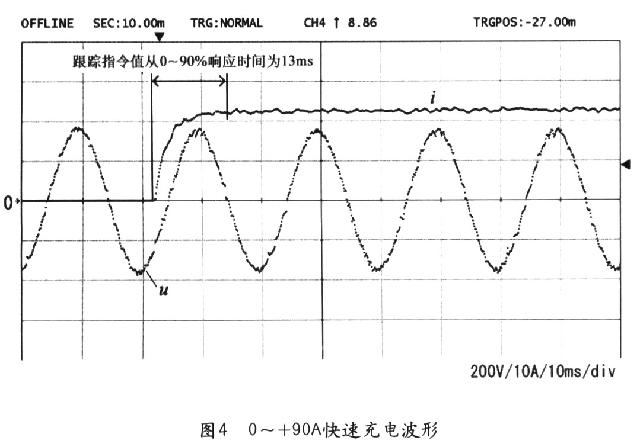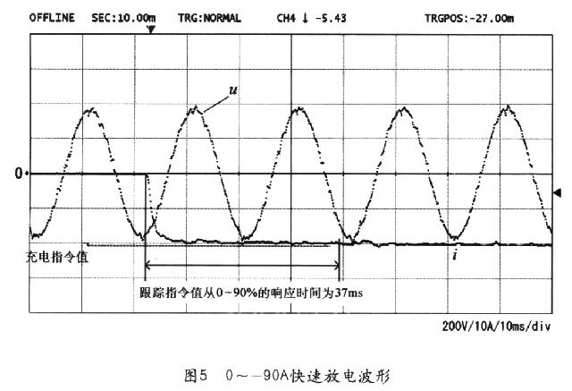本系統(tǒng)中APL2的額定電壓電流為400V/25A,為了擴(kuò)大容量,使用主從功能,最大可以并聯(lián)四臺(tái)APL2,可使充放電電流達(dá)到100A。圖4所示為0~+90A肘的充電電壓電流波形,蓄電池充電時(shí),電流呈階躍式變化時(shí)的響應(yīng)波形;圖5所示為0~-90A時(shí)的充電壓電流波形,蓄電池放電時(shí),電流呈階躍式變化時(shí)的響應(yīng)波形。關(guān)于蓄電池電流,先指定主機(jī)APL2的輸出端電流,而從機(jī)則跟隨主機(jī)的充放電電流指令值而變化。