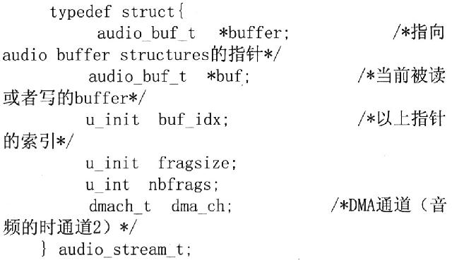 在Write方法中首先判斷設(shè)備文件打開的方式,具有write特性打開的設(shè)備才可以寫入,然后判斷是否沒有建立DMA緩沖區(qū),若沒有,則通過audio_setup_buf()來創(chuàng)建,定義一個結(jié)構(gòu)體(audio_stream_t)的指針如下: