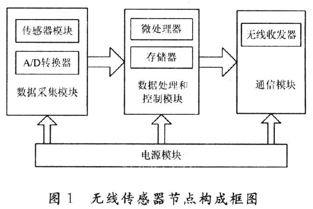 無線傳感器網(wǎng)絡(luò)節(jié)點(diǎn)主要由傳感器模塊、處理器模塊、無線收發(fā)模塊、電源模塊構(gòu)成,如圖1所示。