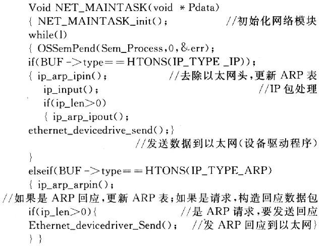 圖4是嵌入式Wi-Fi的軟件結(jié)構(gòu)。將通信的實(shí)現(xiàn)分為三個(gè)任務(wù):分別是網(wǎng)絡(luò)任務(wù)(NET_MAINTASK)、數(shù)據(jù)包接收任務(wù)(ETH_REPOLL_TASK)和周期時(shí)鐘任務(wù)(PERIO_TASK)。這三個(gè)任務(wù)之間相互協(xié)調(diào)完成數(shù)據(jù)從鏈路層到應(yīng)用層或應(yīng)用層到鏈路層的傳遞。網(wǎng)絡(luò)任務(wù)優(yōu)先級在所有通信任務(wù)中優(yōu)先級最高,當(dāng)它完成網(wǎng)絡(luò)各部分初始化工作后,就負(fù)責(zé)對新近接收到的數(shù)據(jù)進(jìn)行處理并向應(yīng)用層分發(fā)。剛開始它會(huì)掛起自己,當(dāng)接收到數(shù)據(jù)包收發(fā)任務(wù)發(fā)送的信號(hào)后轉(zhuǎn)入運(yùn)行狀態(tài)。