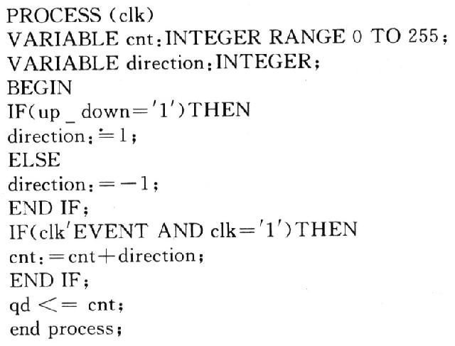 采用硬件描述語(yǔ)言輸入的方法對(duì)于沒(méi)有傳統(tǒng)設(shè)計(jì)方法經(jīng)驗(yàn)的人更容易入門,修改起來(lái)也更方便。給出了一個(gè)可逆計(jì)數(shù)器的實(shí)現(xiàn)實(shí)例,程序的核心部分如下: