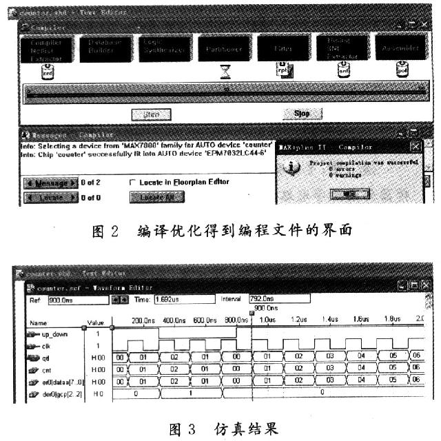 設(shè)計(jì)輸入完后,用Max+plusⅡ的編譯器編譯、查錯(cuò)、修改直到設(shè)計(jì)輸入正確,同時(shí)將對(duì)輸入文件進(jìn)行邏輯簡(jiǎn)化、優(yōu)化,最后生成一個(gè)編程文件,這是設(shè)計(jì)的核心環(huán)節(jié)。