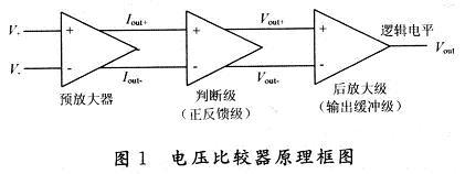 這里介紹的電壓比較器是傳統(tǒng)的預(yù)放大鎖存比較器,采用預(yù)放大器、鎖存比較器和輸出緩沖級級聯(lián)的方式來實現(xiàn),其原理框圖如圖1所示。