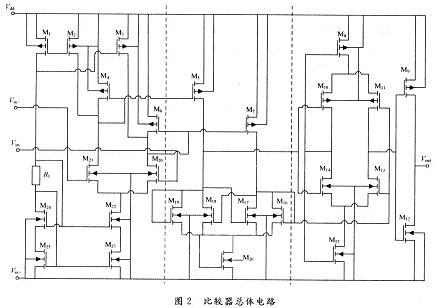 鎖存比較電路是整個比較器的核心部分,它應(yīng)能區(qū)分毫伏量級的輸入信號差。如圖2中第二部分所示, M17,M18交叉互連實現(xiàn)正反饋,以提高比較電路的增益。利用前級預(yù)放大器的輸出,控制鎖存器輸入電流I+,I_的變化,若I_遠(yuǎn)大于I_,則M16和 M18導(dǎo)通,Vout-△0,Uout+=(2L16I+/WμnCox)+VTHN;若I_增大而I+減小,M18的漏一源電壓升高,當(dāng)高到M17的 VTHN時,M17導(dǎo)通,此時M17管開始抽取原來流過M16管的電流,這會使M16管的漏一源電壓下降,并導(dǎo)致M18管截止,電路的輸出狀態(tài)發(fā)生轉(zhuǎn)換。當(dāng)I-增大到一定程度時會導(dǎo)致M18進(jìn)入飽和區(qū),此時臨界電流值I-=(I+)(W17μnCox/L17)/(W16μnCox/L16),該電流臨界點也是輸出電壓發(fā)生轉(zhuǎn)換的臨界點。同理可得,當(dāng)I+增大時,發(fā)生轉(zhuǎn)換的電流臨界點I+=(I-)(W17μnCox/L17)/ (W16μCox/L16)。