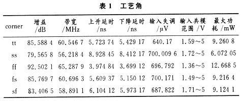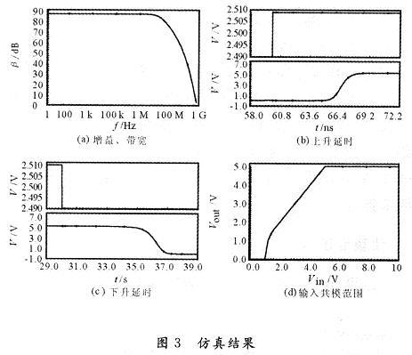 在5 V電源的電壓下,Vin-端加2.5 V參考信號,在Cadence軟件平臺下用Spec-tre工具對基于CSMC 0.5 μmCMOS工藝模型的電路進(jìn)行仿真,得到比較器的增益、帶寬、上升延時、下降延時、輸入共模范圍如圖3所示。