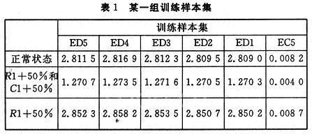 (1)構(gòu)造特征向量,提取能量特征信息:在pspice中對(duì)電路的每一種狀態(tài)進(jìn)行瞬時(shí)分析,取500個(gè)采樣點(diǎn),并對(duì)每一種故障模式進(jìn)行300次 MonteCarlo分析,在Probe窗口中選擇菜單View\output File,或直接在Probe內(nèi)選擇菜單File\Export將波形采樣數(shù)據(jù)存盤,可得到out節(jié)點(diǎn)的具體信息,將數(shù)據(jù)轉(zhuǎn)化為MATLAB數(shù)據(jù)文件,然后進(jìn)行小波分析,在實(shí)驗(yàn)中,經(jīng)分析與比較,小波選擇db2小波,對(duì)每個(gè)故障信號(hào)進(jìn)行5尺度小波分解。得能量特征信息F=(ED5,ED4,…,ED1, EC5)。這里可利用MATLAB中的sumsqr函數(shù)。從而得到網(wǎng)絡(luò)的訓(xùn)練樣本集和測(cè)試樣本集。300次MonteCarlo分析,其中200次為訓(xùn)練樣本,100次為測(cè)試樣本。