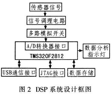 DSP實時震動信號分析和處理系統(tǒng)主要由震動傳感器、前置放大電路、濾波電路、DSP數(shù)據(jù)采集分析模塊以及存儲模塊組成。圖2為系統(tǒng)設(shè)計框圖。
