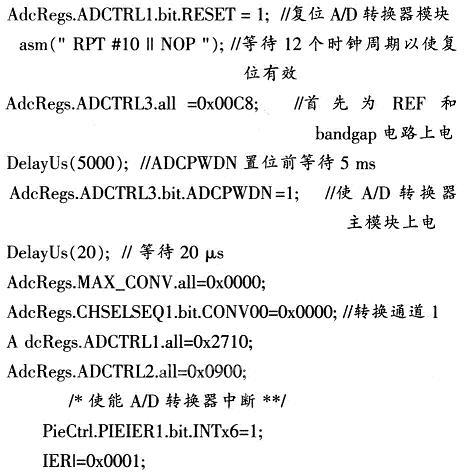 EVA為SEQ1產(chǎn)生ADC SOC信號后,開始對通道1轉(zhuǎn)換,轉(zhuǎn)換結(jié)束后,A/D轉(zhuǎn)換產(chǎn)生中斷信號并調(diào)用中斷處理程序讀取ADCRESULTO中的值存人數(shù)組。當采滿512個點后將程序跳轉(zhuǎn)到數(shù)據(jù)處理程序,調(diào)用FIR和FFT子程序,其中DSP A/D轉(zhuǎn)換器初始化程序代碼為: